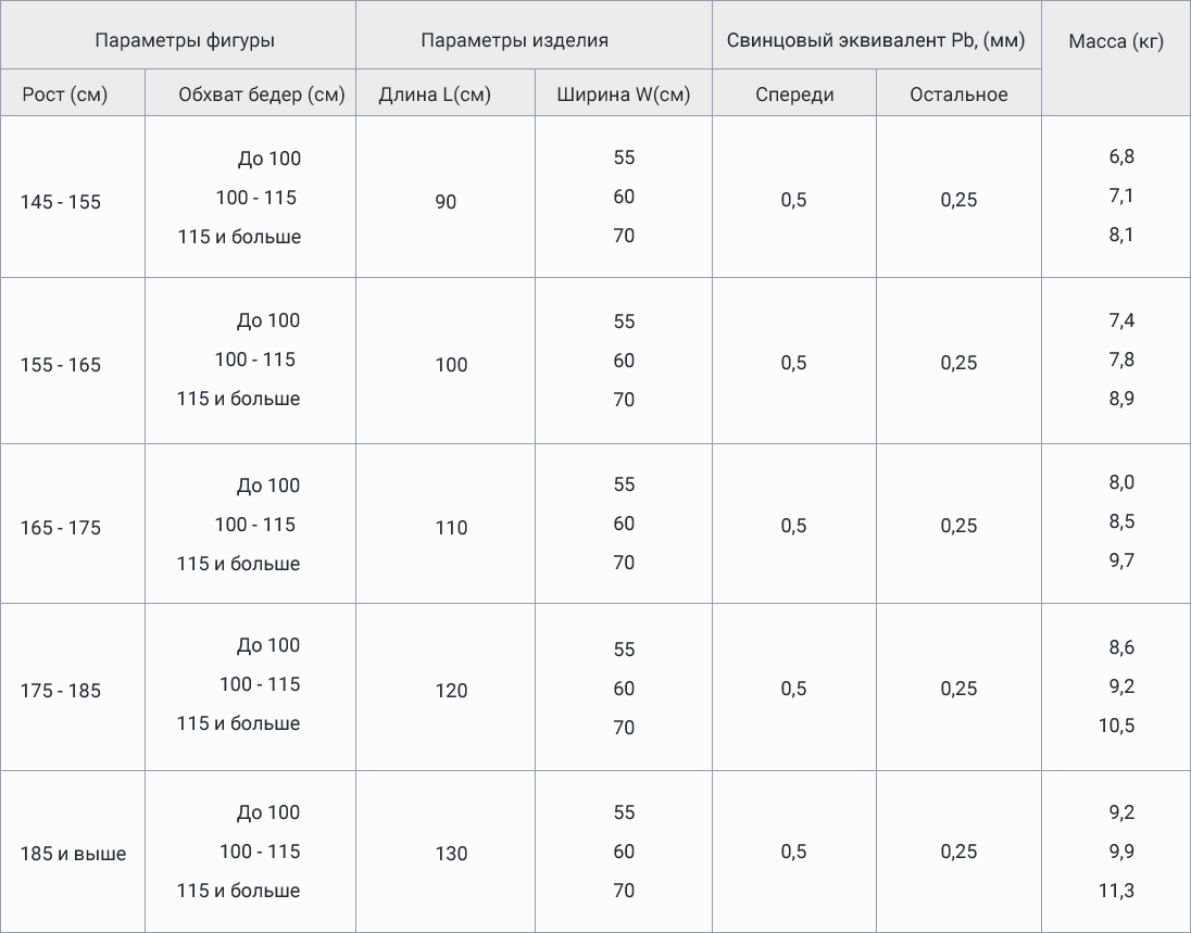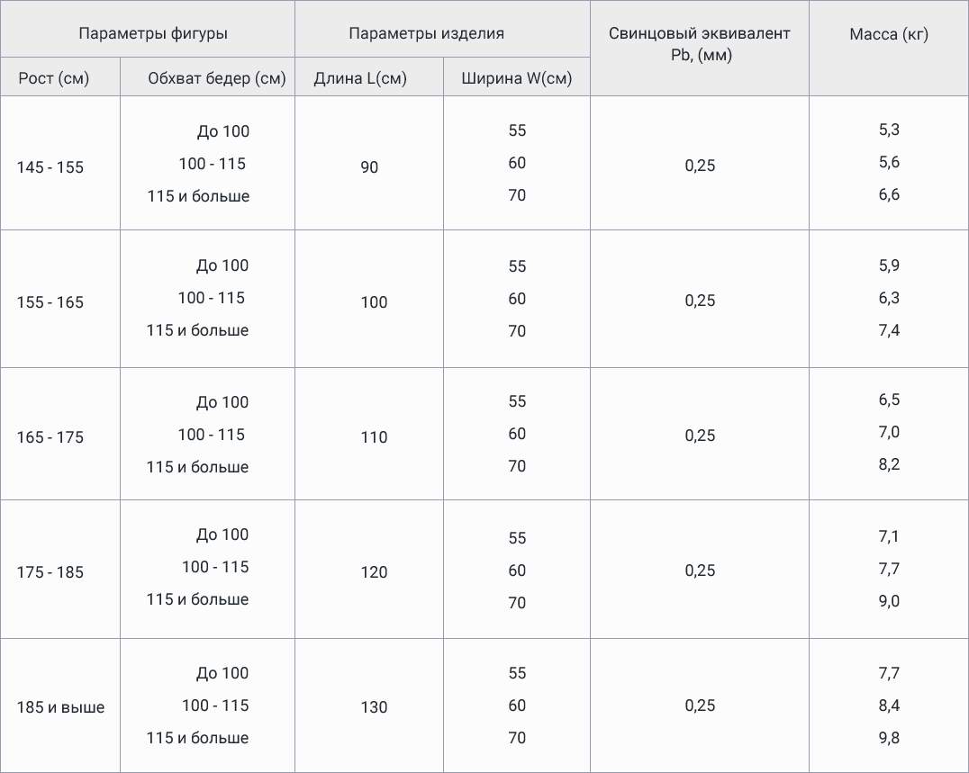 Призначений для захисту спереду від горла до гомілки (на 10 см нижче за коліна), включно з плечима та ключицею, ззаду від лопаток, включно з кістками тазу, стегна збоку. Передня частина перекривається полою халата, подвоюючи свинцевий еквівалент. Можливий індивідуальний пошиття.